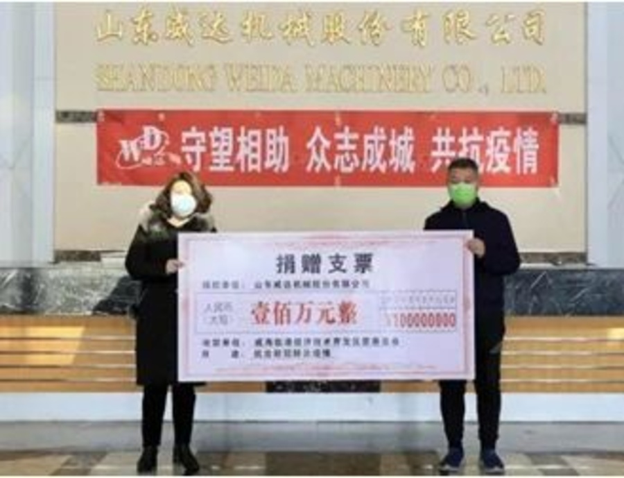 山东威达机械股份有限公司董事长杨明燕,向威海临港经济技术开发区慈善总会捐款现金支票100万元,并紧急调整生产和研发计划,经过多个日夜奋战,成功研发设计出口罩生产线,每小时可产口罩达6000-8000只。