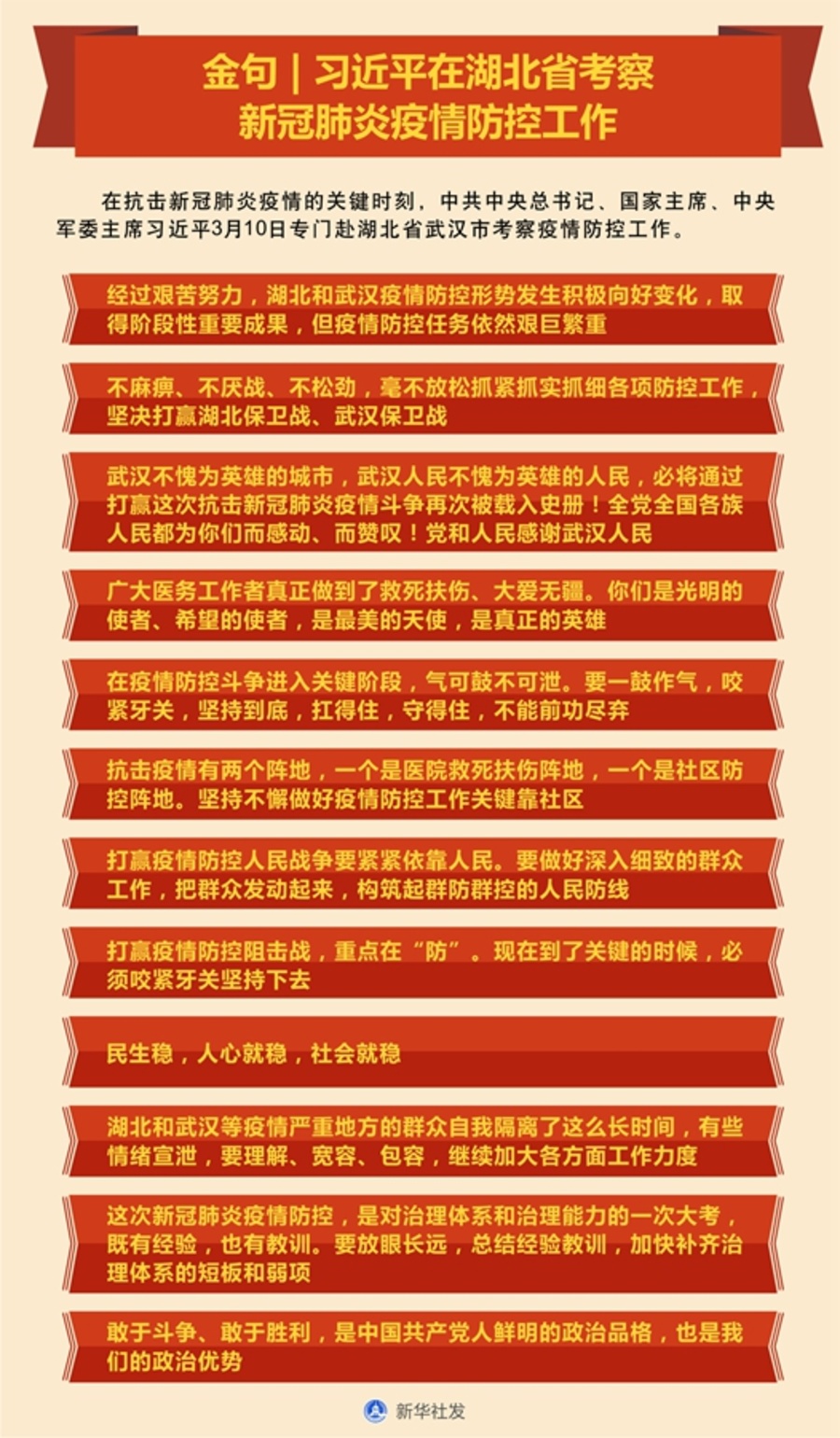习近平指出,在这场严峻斗争中,湖北各级党组织和广大党员、干部冲锋在前、英勇奋战,全省医务工作者和援鄂医疗队员白衣执甲、逆行出征,人民解放军指战员闻令即动、勇挑重担,广大社区工作者、公安干警、基层干部、下沉干部、志愿者不惧风雨、坚守一线,广大群众众志成城、踊跃参与,涌现出一大批可歌可泣的先进典型和感人事迹。