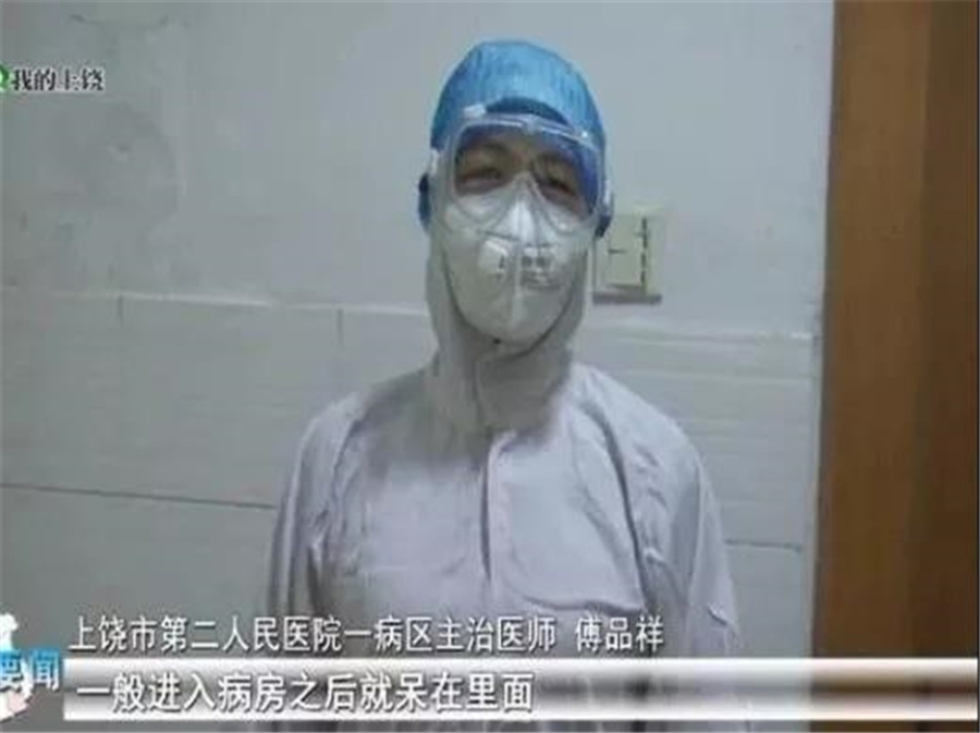 傅品祥,上饶市第二人民医院一病区主治医师。他所在的单位是上饶市收治新型冠状病毒感染的肺炎患者定点医院之一,目前已收治2例新型冠状病毒感染的肺炎患者。疫情发生后,傅品祥主动请缨,坚守岗位,更作为市第二人民医院第一救治小组成员全力救治新型冠状病毒感染的肺炎患者。为了更好的救治病人,也为了节省防护服,他在病房里一呆就是一整天,连厕所都省着去上。而这样的状态已经连续5天了。
