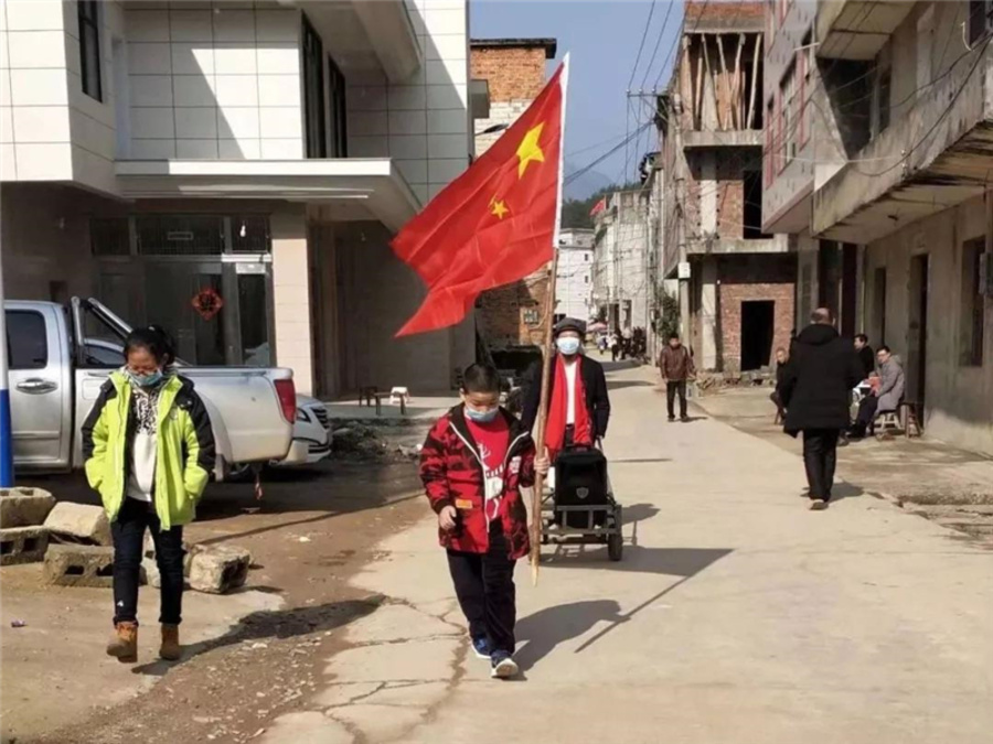 陈文武,上饶市社员,在玉山县怀玉乡锦溪村组织村民在全村走街串巷宣传疫情防范与自我保护常识。