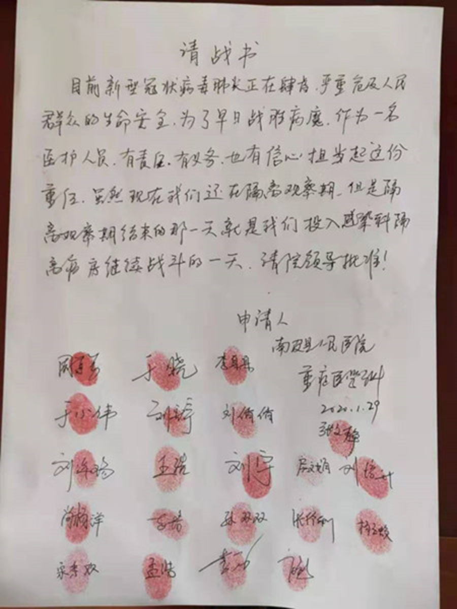 虽然被隔离观察,但田红丽和重症医学科的主任周连军,在微信中提出一个倡议:写下请战书,一旦解除隔离,大家继续回到救治一线,肩负起医护人员的职责和使命。