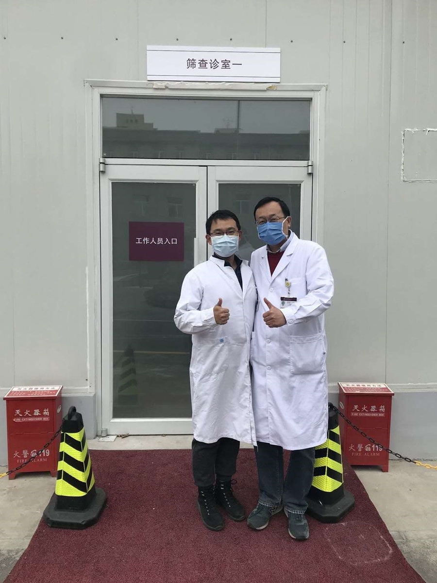 2月,阜外医院支社刘文超大夫(左)和孙宏涛主任(右)在医院发热门诊筛查诊室。