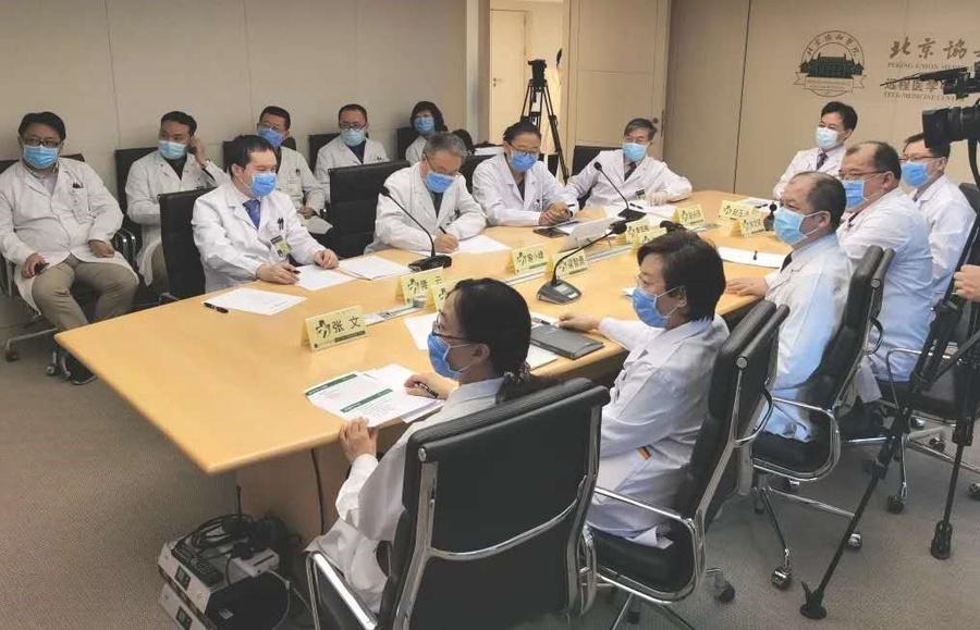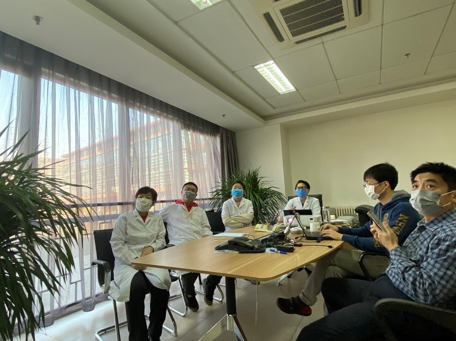 曾小峰主任参加北京-武汉两地专家对重症新冠患者的会诊(图示北京协和医院院领导和各科医疗专家组成的在京远程会诊团队,中排左二为曾小峰主任)
