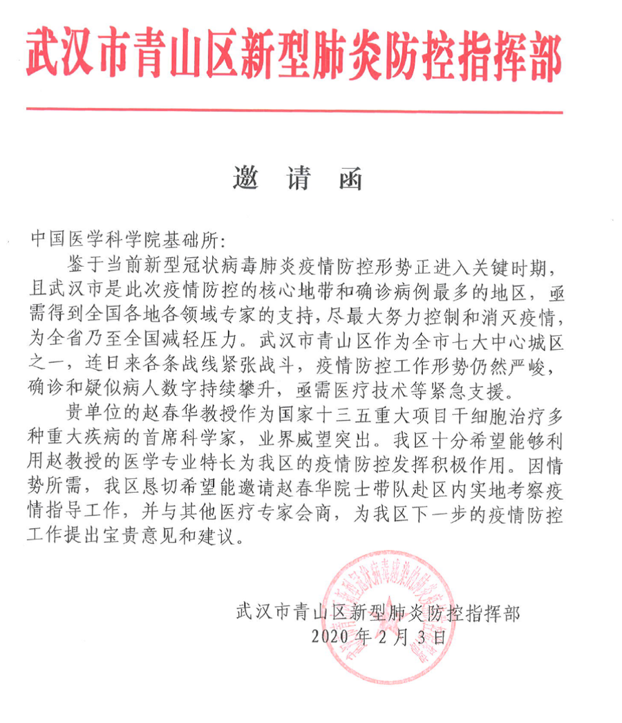 2月,武汉市青山区新冠肺炎防控指挥部邀请基础医学研究所支社赵春华主委带领科研团队赴汉开展新冠肺炎干细胞治疗研究。