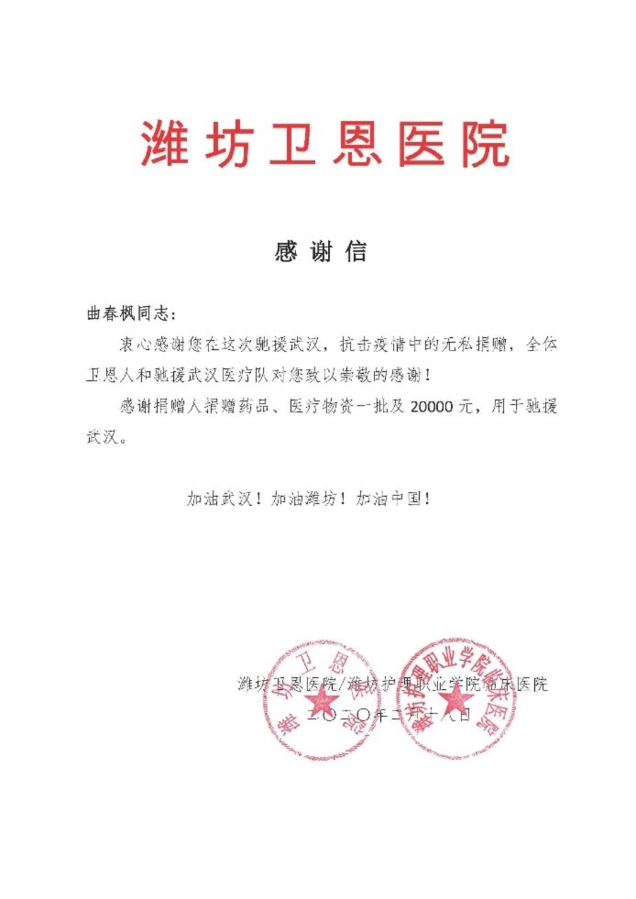 曲春枫主委向驰援武汉的医疗队捐赠药品、医疗物质一批及现金2万元。