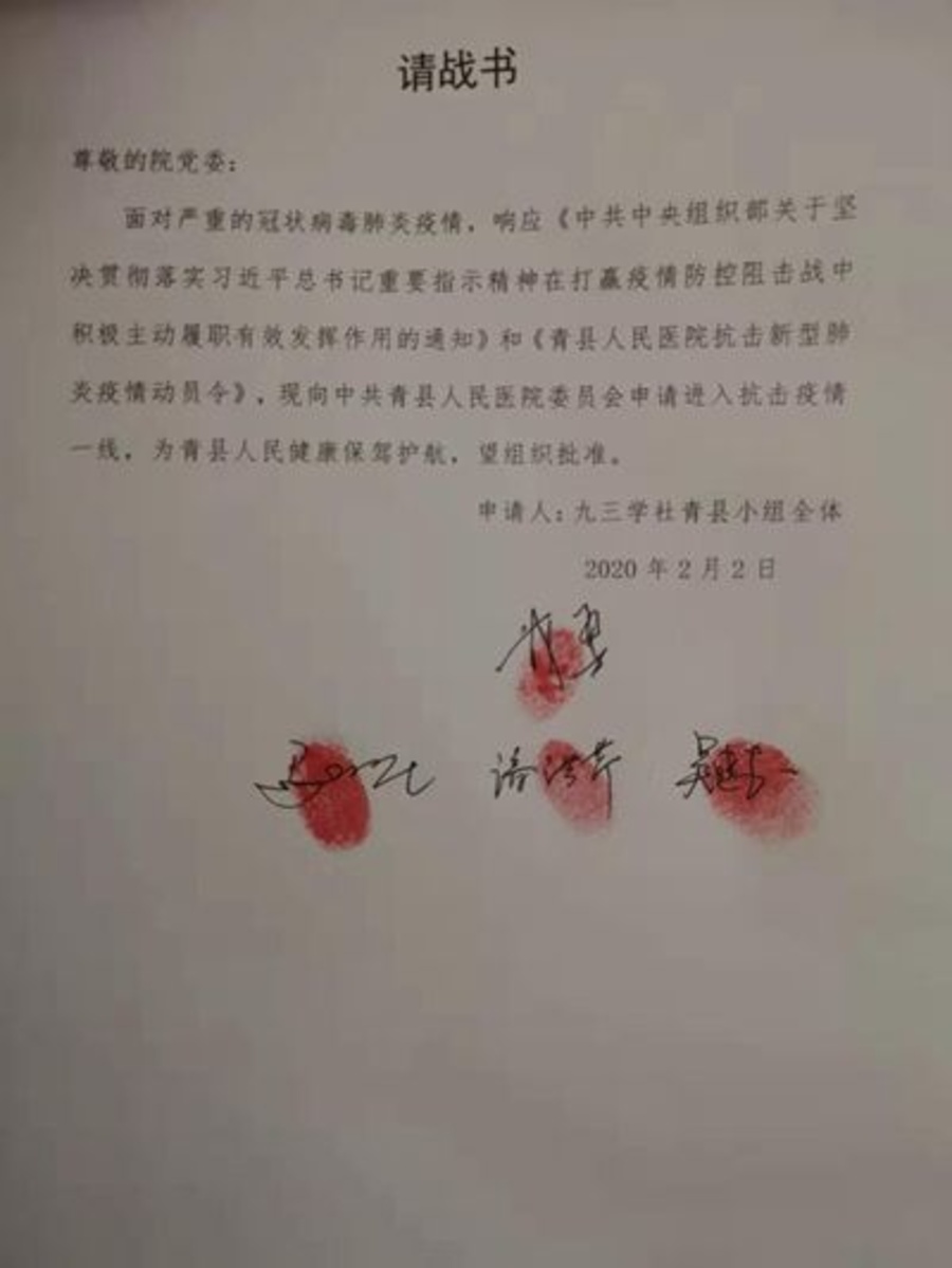 新型冠状病毒感染的肺炎疫情发生以来,感染病例持续增加,全国疫情严重。作为医务人员,九三学社青县小组的四名社员同样奋战在青县抗击疫情一线。面对这场无硝烟的战役,他们毫无所惧,主动递交请战书要求进去抗击疫情一线,与一线医务人员并肩战斗,同时每人捐款500元用于疫情防控。这封请战书,充分表达了九三学社社员不畏困难、随时待命、赶赴一线的决心,表现出九三学社社员、医务工作者的社会责任与使命担当,用实际行动践行九三人严守初心、严守医生职业情操的承诺。