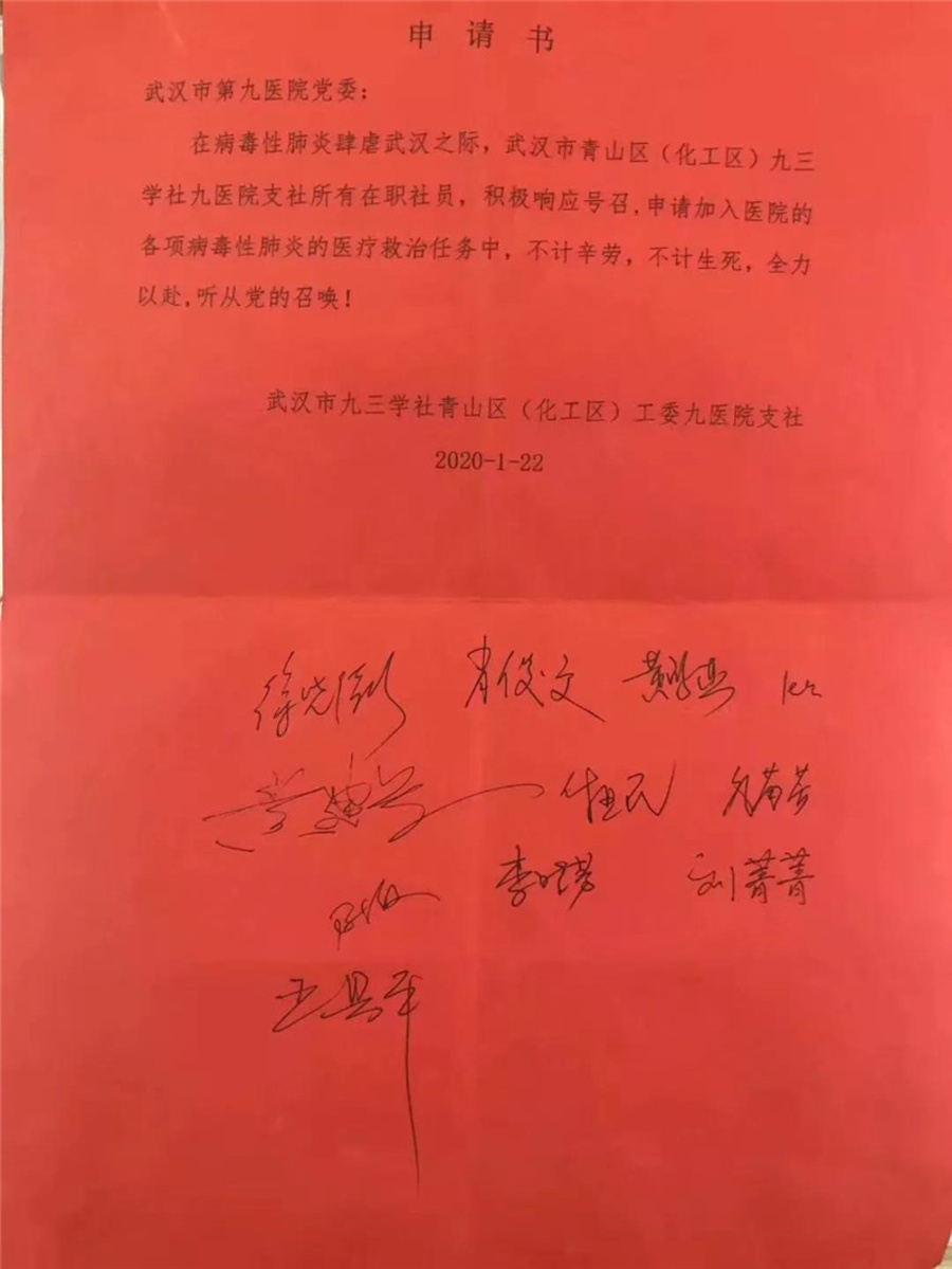 九三学社武汉市青山区(化工区)工委九医院支社集体向医院提交申请书,申请加入医院的各项病毒性肺炎的医疗救治任务中,不计辛苦,不计生死,全力以赴,听从党的召唤。