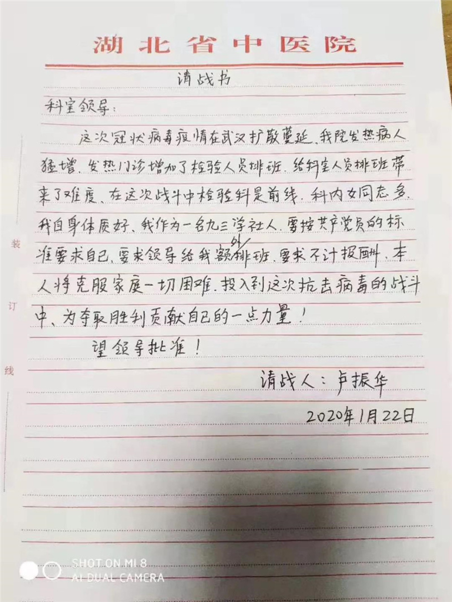 卢振华医生递交请战书,写到,科内女同志多,我自身体质好,作为九三学社人,要按共产党员的标准要求自己,要求领导给我额外排班,不计报酬,将克服家庭一切困难,投身到这次抗击病毒的战斗中,为夺取胜利贡献自己的一点力量。