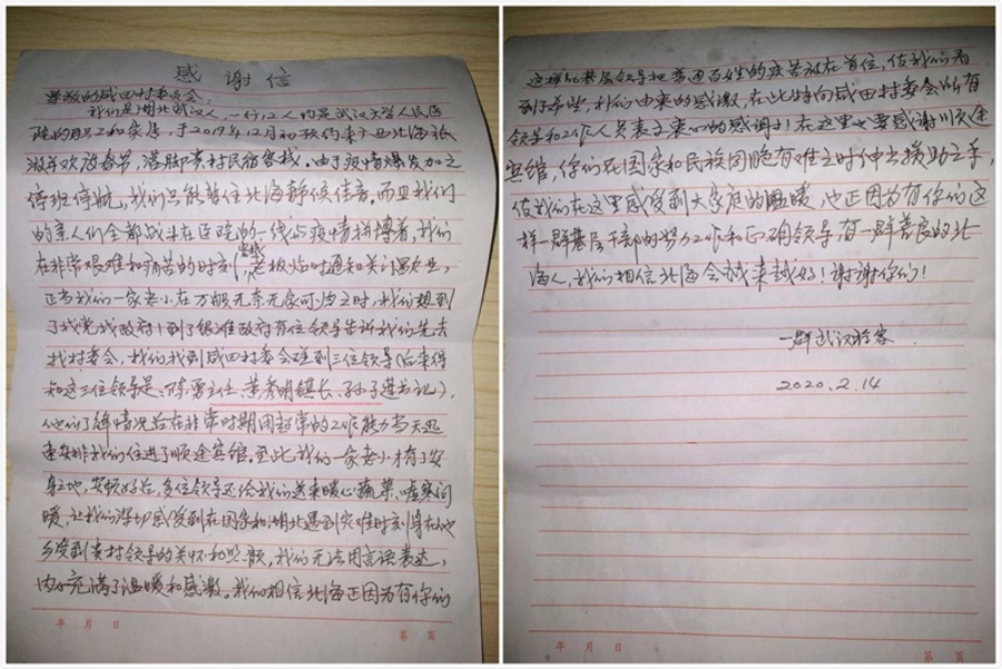 近日,一封署名为“一群武汉游客”写的感谢信,送到了九三学社社员、北海市银滩镇副镇长、银滩镇疫情防治总联络员黄秀明的手里。这是武汉大学人民医院的职工和家属一行12人,春节前到北海旅行,因新冠肺炎疫情滞留当地。黄秀明和当地领导得知情况后,妥善安排武汉游客食宿生活,他们心存感谢而写的一封信,“感谢你们在同胞有难之时伸出援助之手.....”