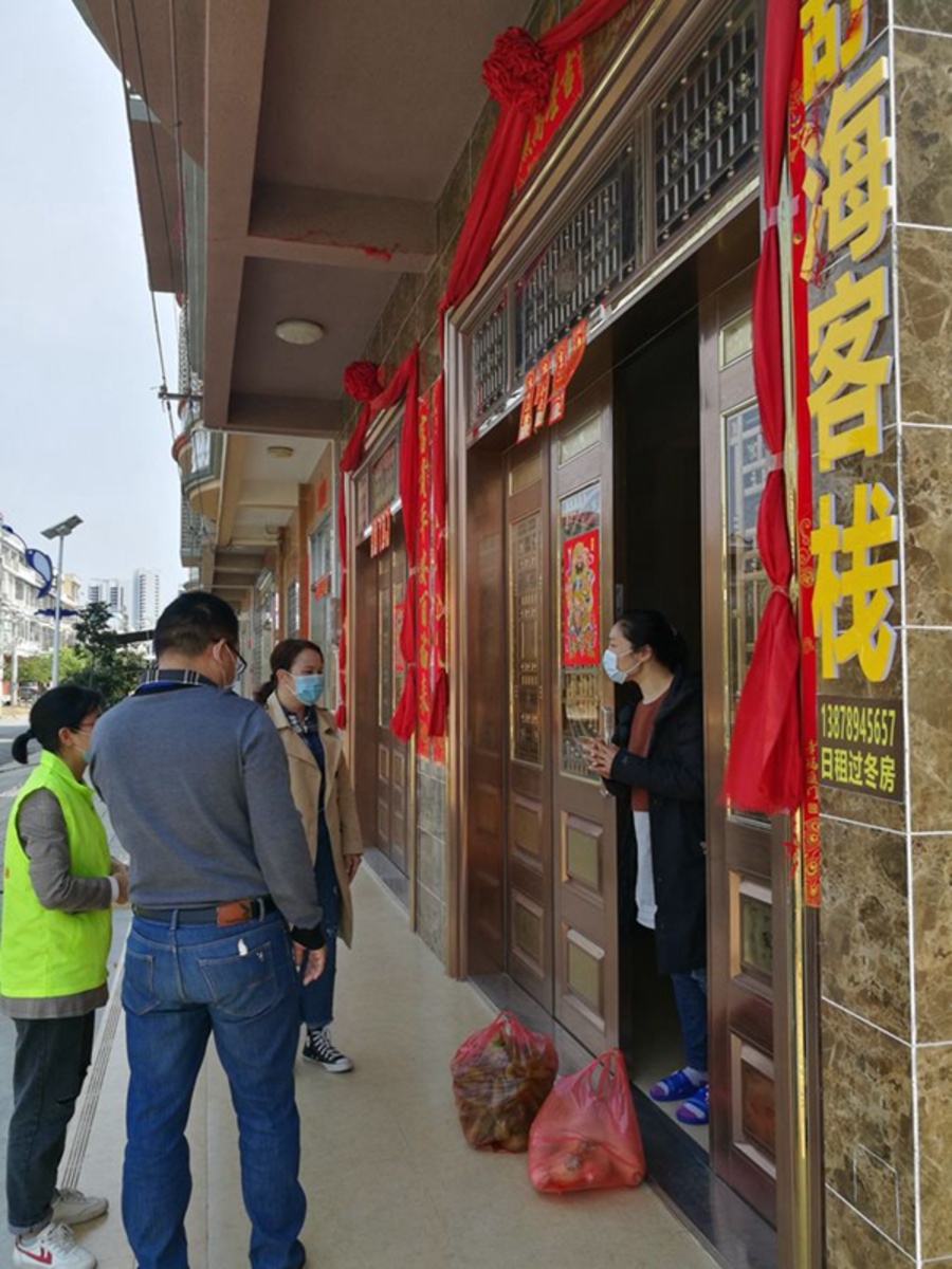 1月21日,疫情爆发之初,黄秀明就开始积极主动作为,率先带领白虎头村委、咸田村委对疍家小镇的酒店、民宿、宾馆的外来人员进行排查登记,并第一时间向银海区政府汇报排查情况。