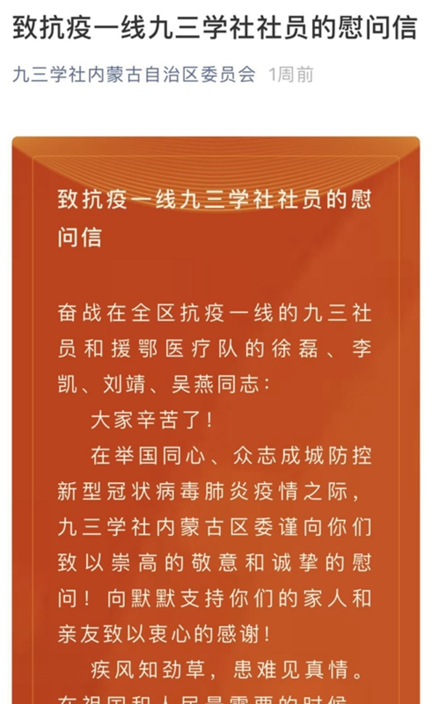 在抗击疫情的最前沿援鄂医疗队伍中有四位内蒙古籍九三社员:徐磊、李凯、刘靖、吴燕。万家团圆的日子里他们告别家人,拼杀在抗击疫情的第一道壕堑,与湖北人民心手相连,用精湛的医术、无私的奉献诠释着九三精神,用爱为寒冬“升温”。