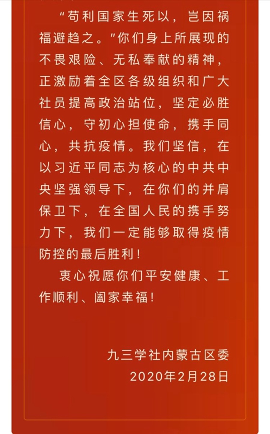 社区委第一时间将社中央和社湖北省委的慰问信转发给驰援湖北的四位九三社员,并传达了社区委对他们的慰问和关怀,勉励大家在做好自身防护的同时,为打赢疫情防控阻击战作出更大贡献。四位社员在接收到各方慰问后,对社组织和关心他们的社员表示感谢。他们一致表示“祖国一家亲,湖北需要我们。作为九三人,更应该肩负起应有的责任,积极响应九三社中央的号召,投身抗疫一线,发挥九三凝聚科技和医学专家的优势,为国家贡献力量。我们一定认真工作,完成任务,做好防护。”