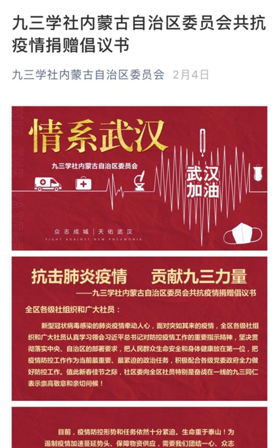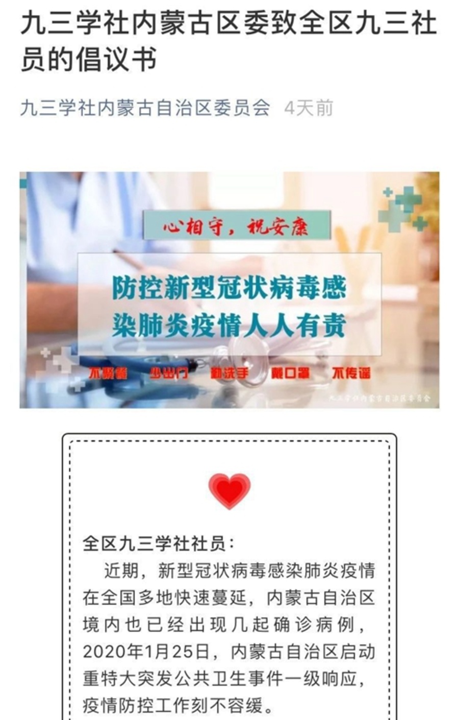 正值农历春节之际,新型冠状病毒感染的肺炎疫情来势汹汹,牵挂着全国人民的心。面对疫情蔓延的严重形势,内蒙古九三学社各级组织和广大社员认真学习领会习近平总书记对防控疫情工作的重要讲话、重要指示精神,坚决贯彻落实中央、自治区的部署要求,把人民群众生命安全和身体健康放在第一位,把疫情防控工作作为当前最重要、最紧迫的政治任务,充分发挥自身优势,积极投身到疫情防控大局中,坚定信心,团结奋战,为打赢疫情阻击战贡献九三学社的智慧和力量。