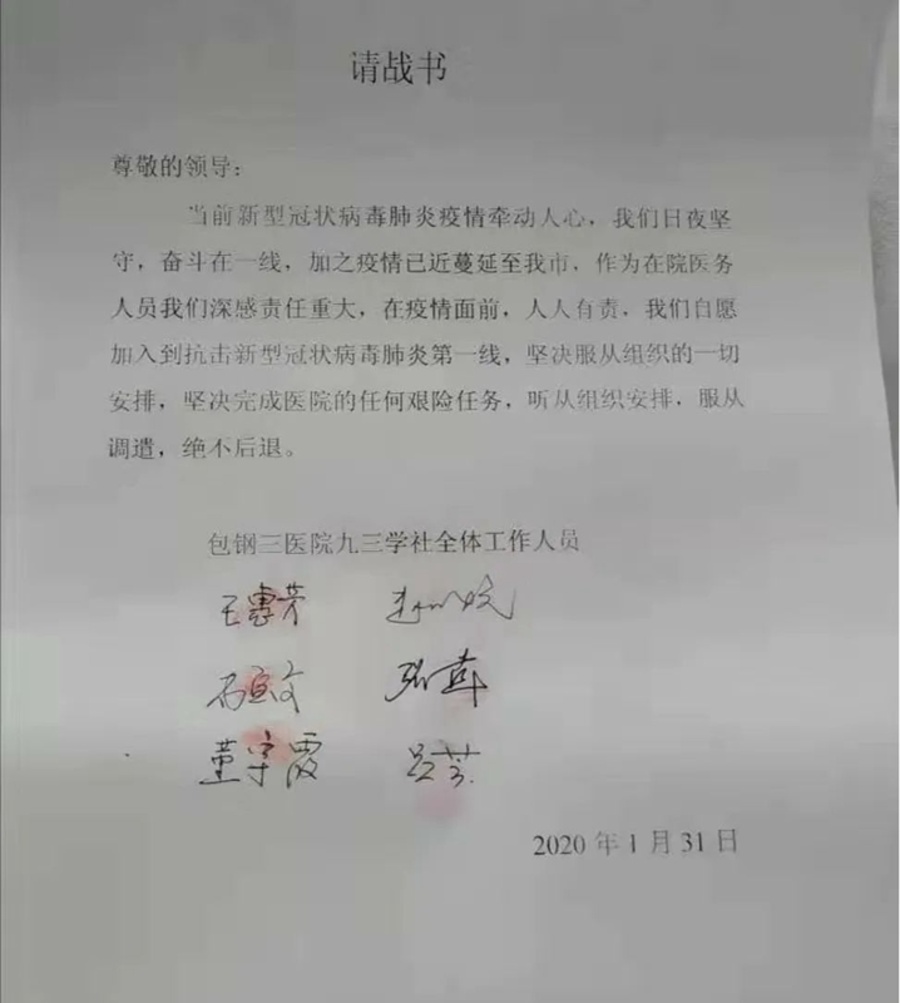 灯亮一盏,光洒成片。一封封请战书、一个个红色指印、一个个签名,是内蒙古九三人“以命相托”应对新型冠状病毒感染的肺炎疫情阻击战的决心和担当!在他们发出“若有战,召必回,战必胜!”的铮铮誓言中,浸润并弘扬着九三人的明责、履责、尽责……,向他们致敬!愿他们平安!