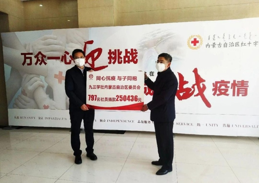 (3月2日,九三学社内蒙古区委专职副主委兼秘书长刘德代表全区各级组织和广大社员,向内蒙古红十字基金会捐赠了250436元爱心善款,定向用于全区疫情防控工作。)