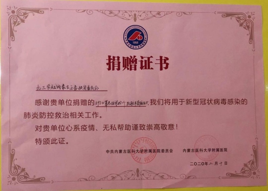 (九三社员李佳霖以个人名义给包头总商会捐款51万元,用于疫情防疫。)