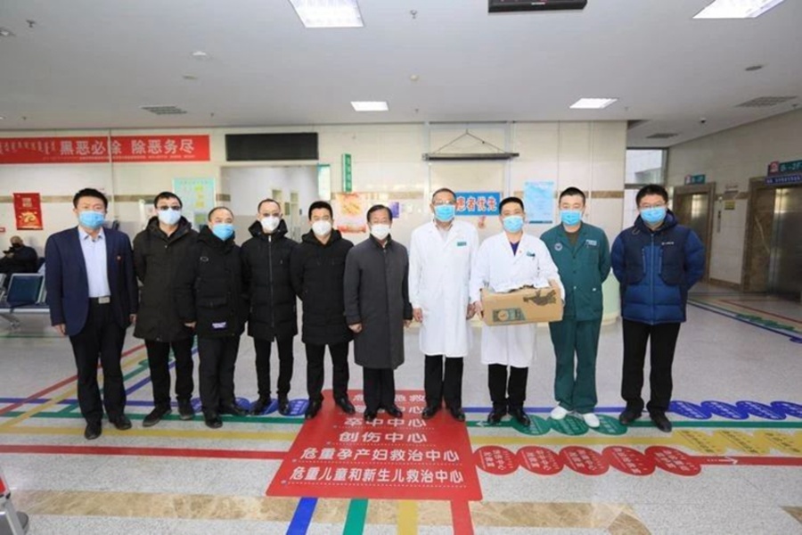 (九三学社内蒙古自治区扶贫委员会为内蒙古医科大学附属第一医院的医务工作者们捐赠物资。)