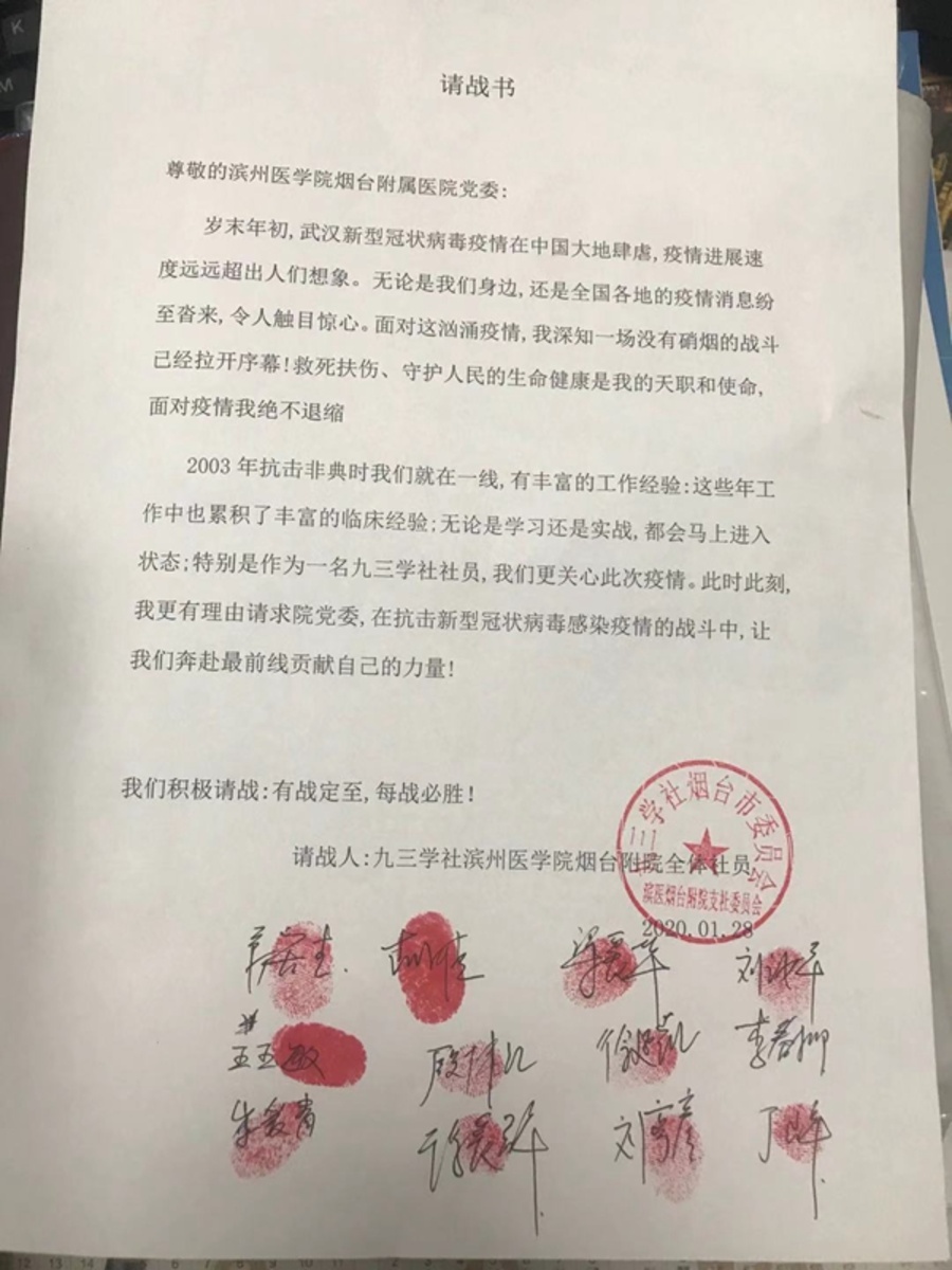 滨州医学院烟台附属医院的多位青工委委员和青年社员春节期间一直奋战在工作岗位上,放弃休息连续值班。徐延凯、李春柳、刘汝平等共12位社员于1月28日向医院党委提交请战书,主动要求到新型冠状病毒肺炎疫情一线参加战斗。宋修丽开通网上24小时心理咨询服务,为百姓心理健康保驾护航。李笑莹工作在疫情防控一线,2月4日,她在呼吸内科门诊接诊了一名患者,凭借丰富的临床经验她意识到患者可能是超出观察期发病的病例。她果断请示上级专家,立即联系将病人收治于隔离病房,2月6日下午,该病例确诊。她的及时处置极大避免了病毒的扩散。