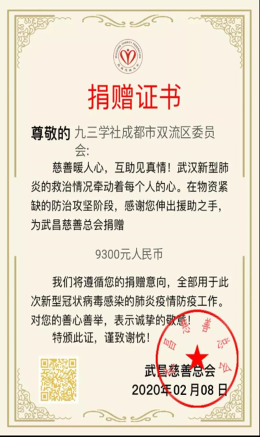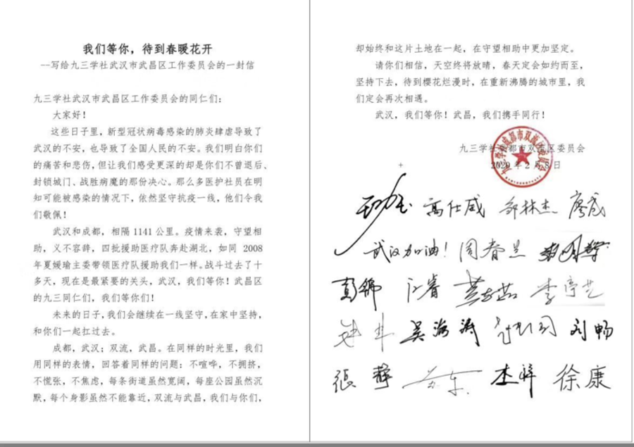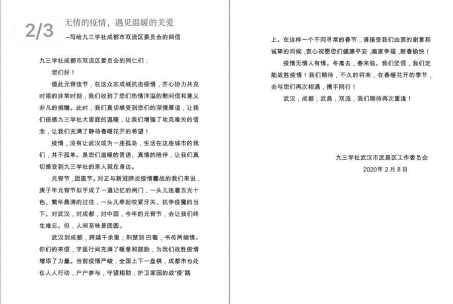 2月8日晚,微信“发送”按键一点,屏幕的另一端,社武昌区委收到了这封书信。随书信一道送达的,还有双流九三人捐来的9300元爱心款。