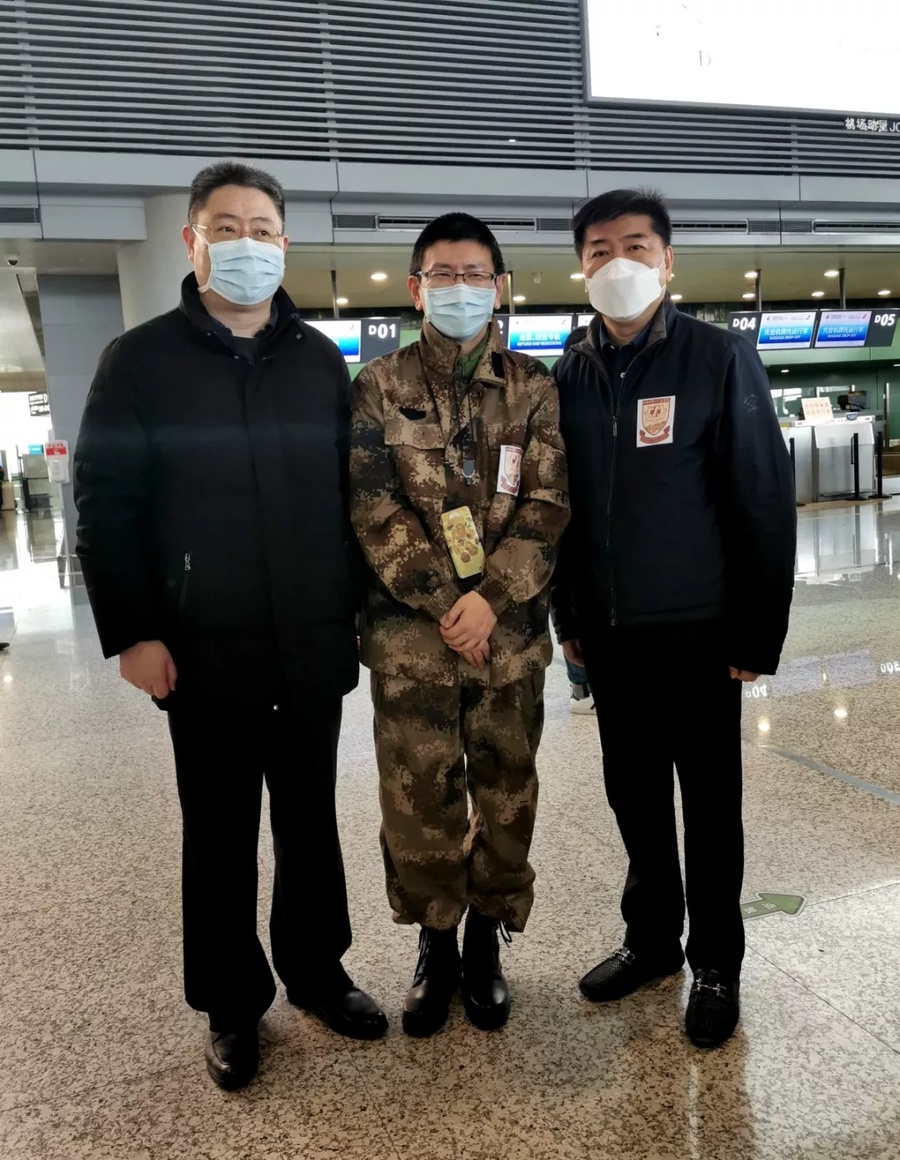 九三学社上海市委申康委员会副主委、市一院支社主委、上海市第一人民医院嘉定分院执行院长郑亚群(右一)和九三学社社员、上海市第一人民医院副院长钟力炜(左一)在机场为毛建强送行。