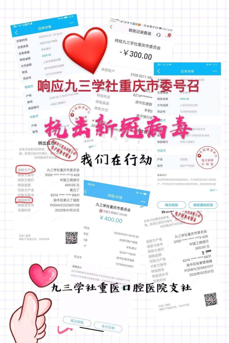 令人感动的是,倡议一发出,便得到全区基层组织和社员的积极响应与强烈支持!各基层组织主委积极带头捐款,多次在微信群里动员大家献爱心;重医大附一院支社的刘煜亮和妻子都在湖北一线支援,还委托支社主委转来了500元捐款;不少退休社员也心系疫情,84岁的叶之美老师、82岁的张万钟老师不会使用手机银行转账,托年轻社员转来了捐款;驻扎在重庆“重灾区”万州的社员童瑾,也在百忙中转来了捐款……不到三天时间,全区163名社员参与捐款,共筹得捐款金额72766元。这笔捐赠资金将带着全区社员的爱心,由九三学社重庆市委统筹安排,用于疫情防控第一线。