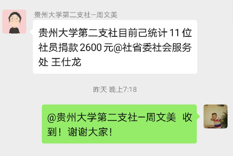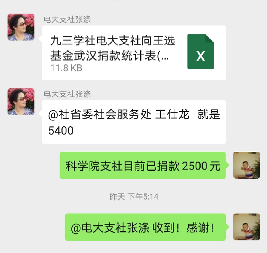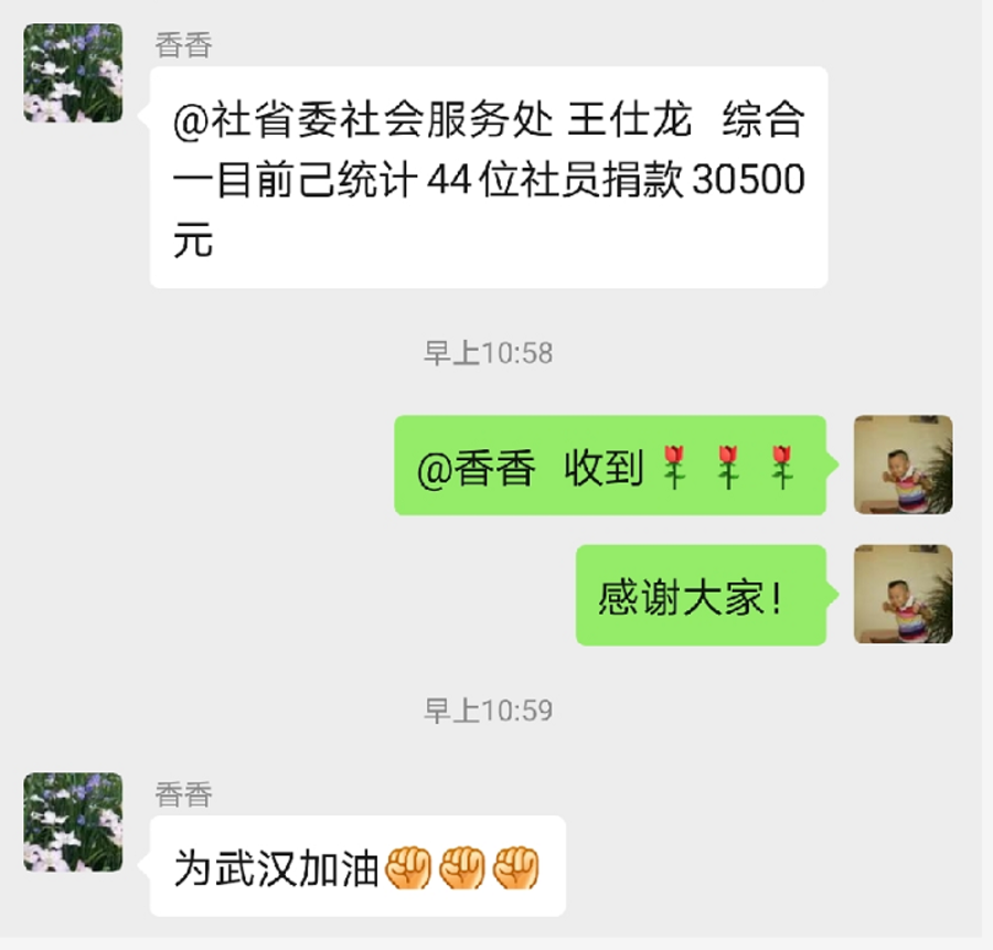 社贵州省委领导及机关干部职工不到两小时就捐款13400元,包括两位退休同事在听到捐款消息后,通过王选基金会渠道各自捐款1000元。善行始终在持续,捐款一直在进行,越来越多的社员闻声而动,慷慨解囊,持续刷新着捐款数据。据不完全统计,截止2月5日14时,社贵州省委会、各级社组织和部分社员,通过九三王选关怀基金会驰援武汉抗击新型冠状病毒肺炎专项基金渠道,共计捐款207120元。