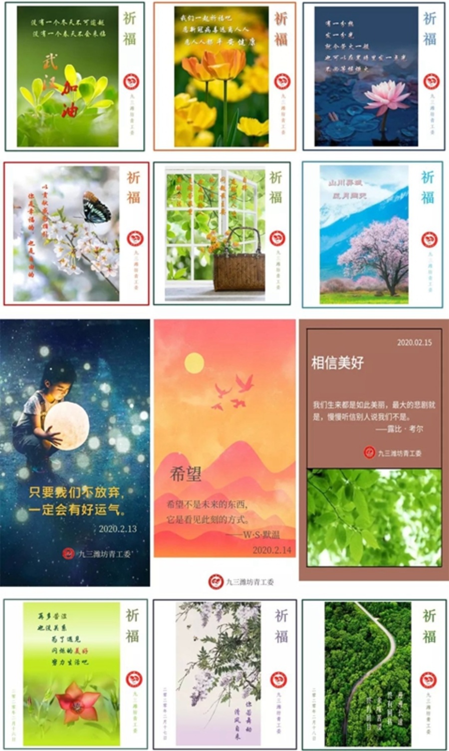 九三学社潍坊青工委响应社市委号召,积极发动青年社员,围绕抗疫主题,创作一批“日签”图文作品,通过搜集温暖和激励人们心灵的名人名言、社科知识等,形成分享座右铭和人生感悟的窗口,为武汉加油,为平安祈福,为抗疫贡献智慧和力量。截止目前,已累计创作日签作品10余幅,由青工委副主任岳连红、冯君妍,委员马云云、沈法鹏、文居亭、杨淼淼、周雪梅参与创作。