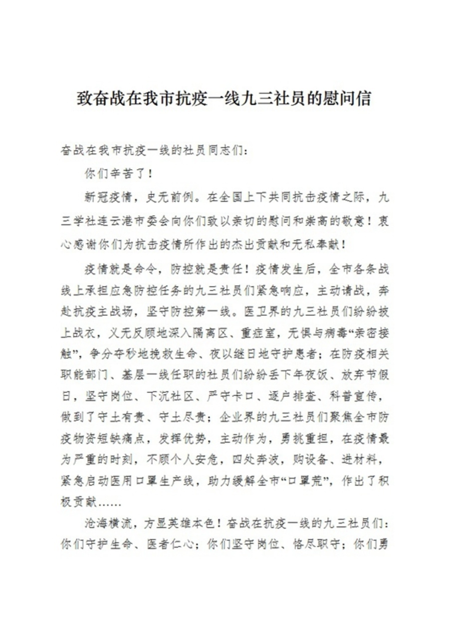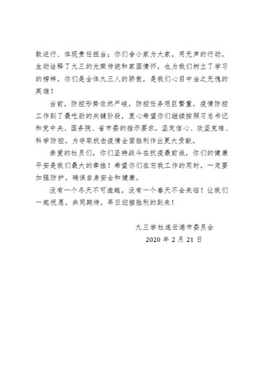 新冠肺炎疫情发生以来,九三学社连云港市委认真贯彻落实中共中央和省市委决策部署及工作要求,全社上下众志成城,共抗疫情,各条战线的社员们紧急响应、主动请战,奔赴抗疫主战场,坚守防控第一线,体现了九三学社的责任担当,涌现出一大批忠于职守、不畏艰险、勇敢逆行的感人事迹和先进典型。
