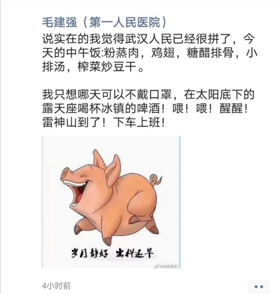 在雷神山,九三学社社员,上海中医药大学附属岳阳医院老年病科主治医师姜恺、上海交通大学附属第一人民医院心脏及大血管外科副主任医师毛建强、复旦大学附属上海市第五人民医院消化科副主任医师付明生、上海交通大学附属第六人民医院内分泌科主治医师张磊在忙碌之余,记录了许多温暖、浪漫的小瞬间,看到这样烟火气息十足的朋友圈,让我们感到,雷神山有爱,有故事!