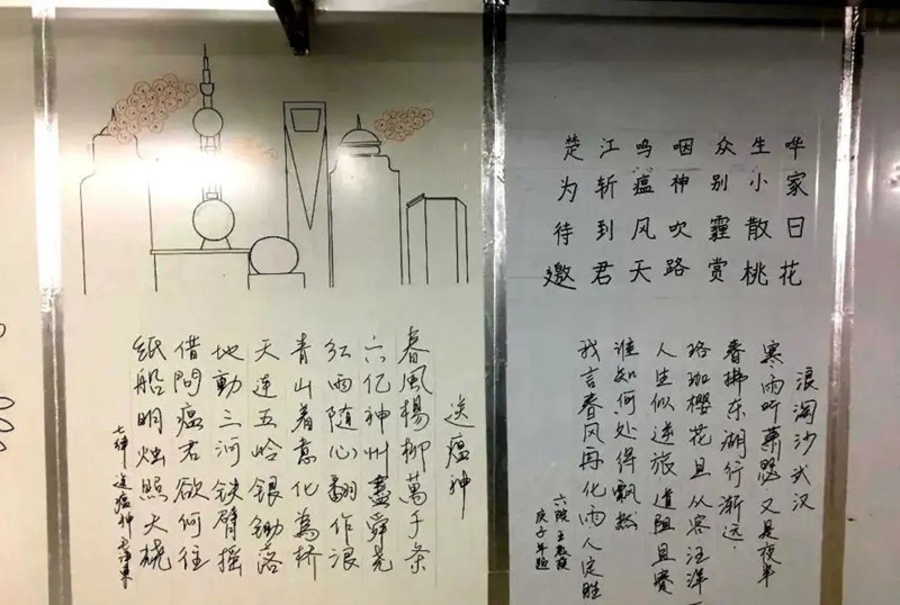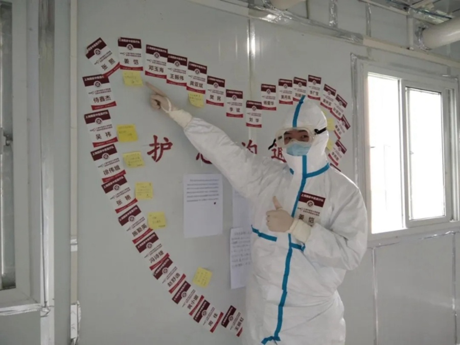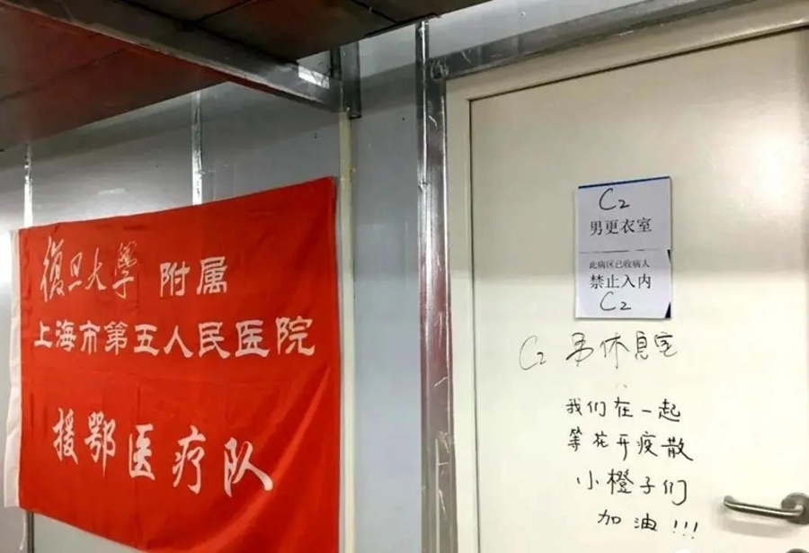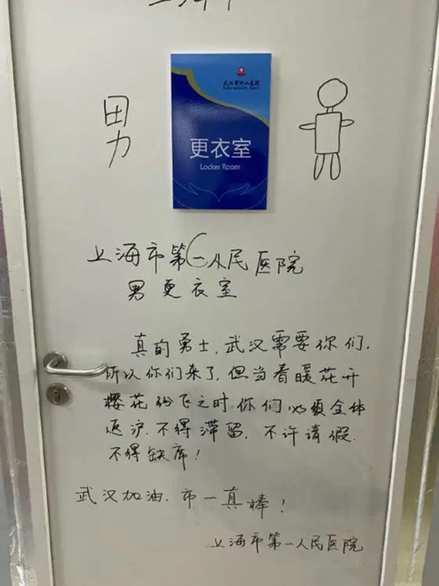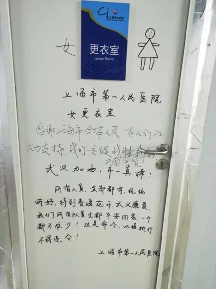 通过层层叠叠的防护门,疲劳之余看到门板上的“留言对话”,心里暖暖的。