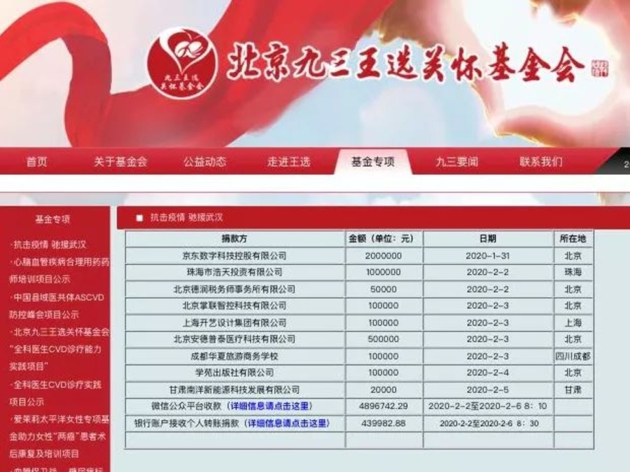 1月25日大年初一,九三学社中央领导指示王选关怀基金会尽快设立专项基金,通过社湖北省委协调,支援湖北省疫情一线防控。在九三学社中央促创工委副主任、京东数字科技控股有限公司副总裁傅彤的多方联系下,京东数字科技控股有限公司决定首期向九三王选关怀基金会捐资200万元,与九三学社中央和九三王选关怀基金会共同发起成立抗击新型冠状病毒肺炎专项基金。该捐款平台自2月2日上线以来,得到各级社组织和广大社员的强烈支持。截至2月6日,平台已收到捐款930多万元。目前,基金会正积极采购防疫紧缺医疗物资,与社湖北省地方组织沟通捐赠事宜。