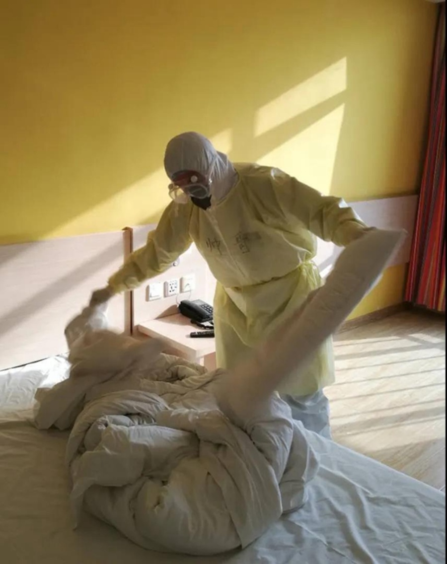 芝罘区妇幼保健院放射科主任张进,带领全科多次向医院请求上一线, 3月2日,张进进入芝罘区“新冠肺炎医疗服务中心”工作, 除负责采录信息、测量体温、清洁房间、处理生活垃圾等工作外,还主动承担起消杀重任。