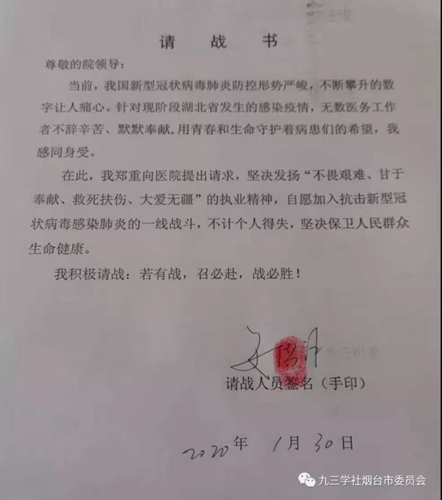 烟台市医务界社员分别向各自医院党委递交了请战书,鲜红的手印代表着他们的决心。烟台市直接在一线从事抗击疫情工作的社员近百名,他们以英勇无畏的精神、专业扎实的素养构筑起抗击疫情的坚固长城。