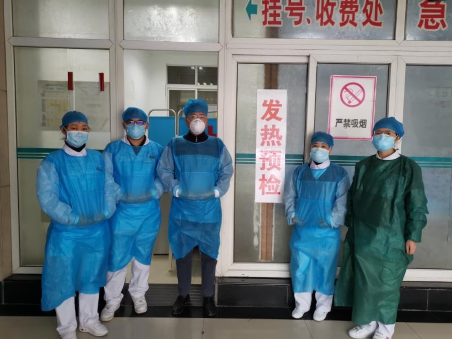 社贵阳市委常委、贵阳市第一人民医院急诊科主任张流忠(左三)和同事们一直坚守在抗疫第一线