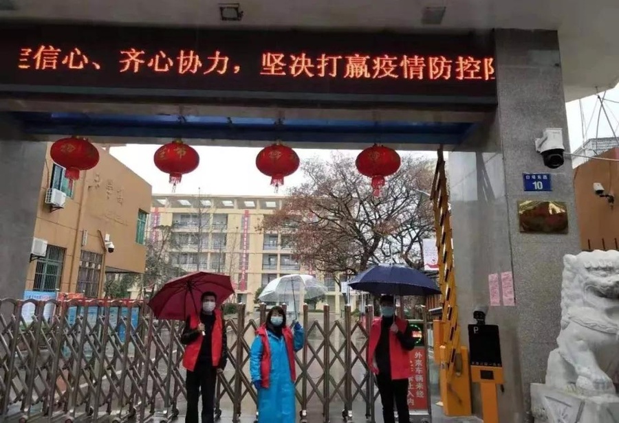 余素文,九三学社鹰潭市月湖支社社员。作为疫情防控志愿者,日夜坚守在防控一线,为百姓安全筑起一道"防疫墙"。图为余素文在四青街道水泵厂社区五洲花园值班值守。