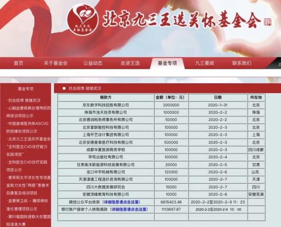 专项基金上线以来,京东数字科技控股有限公司、珠海市浩天投资有限公司董事长陈利浩、北京安德普泰医疗科技有限公司,九三学社各级组织和广大社员及社会各界慷慨解囊,踊跃捐款。截止2月8日上午9:30,共收到捐款1135.95万元。