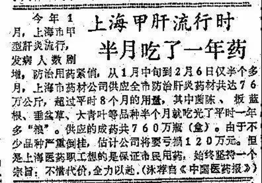 其实一般情况下甲肝病人是会自愈的。西药里也没有治疗它的特效药,治疗过程中也不过是吃一片维生素B、两片维生素C。有时候病人实在恶心呕吐得厉害,为了防止脱水,就输一点液。虽然板蓝根未必多么有效,但因为有了“吃中药板蓝根可以防治甲肝”的传言,一时间,全国各地的板蓝根几乎都向上海运输。尽管价格不断上涨,依然供不应求。