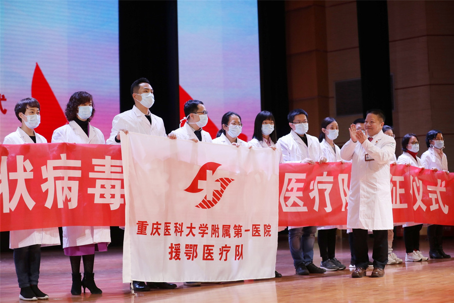 20名重庆医科大学附属第一医院的医务人员站成一排,他们即将出征,驰援湖北抗击新型冠状病毒感染的肺炎疫情。