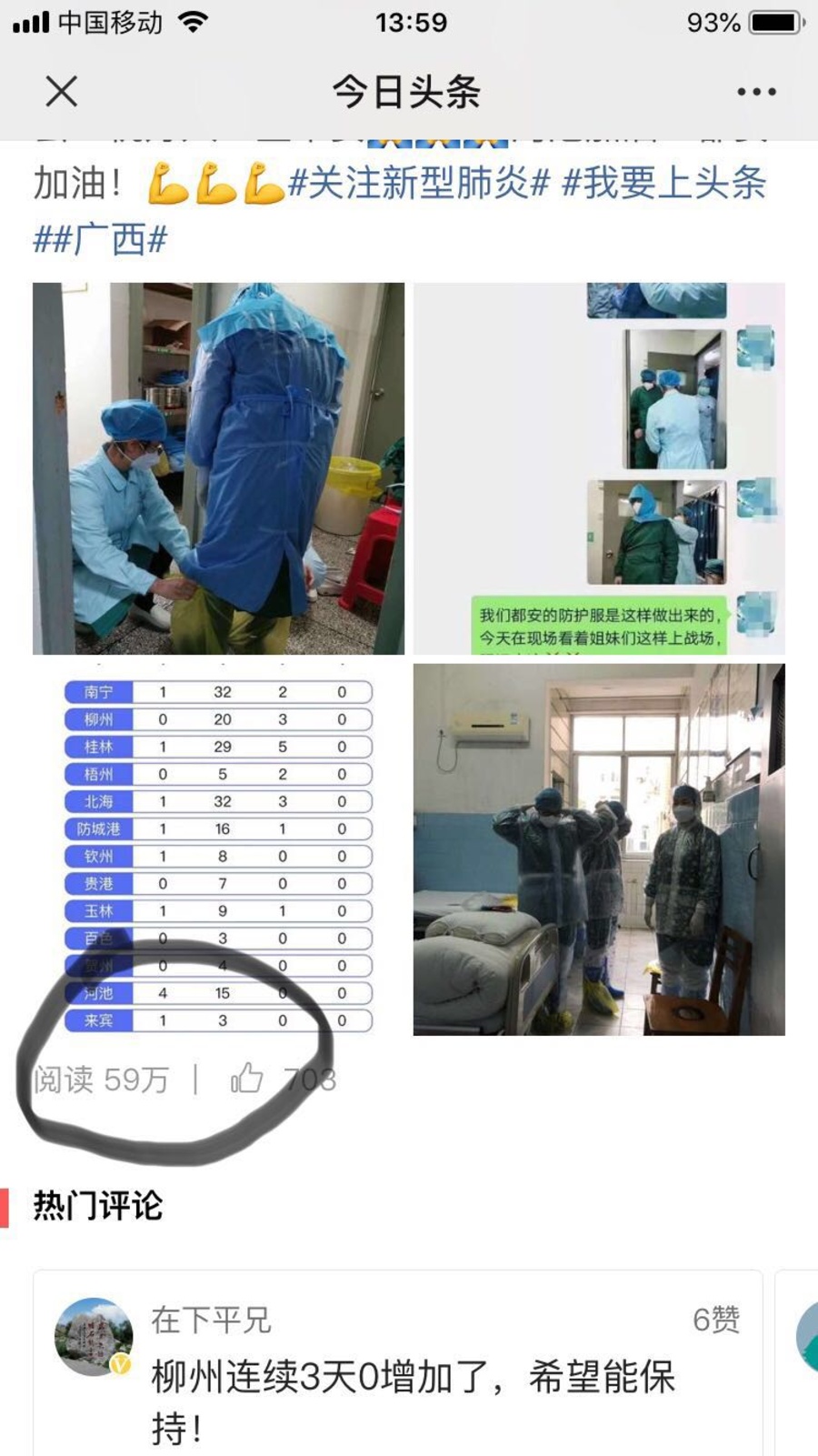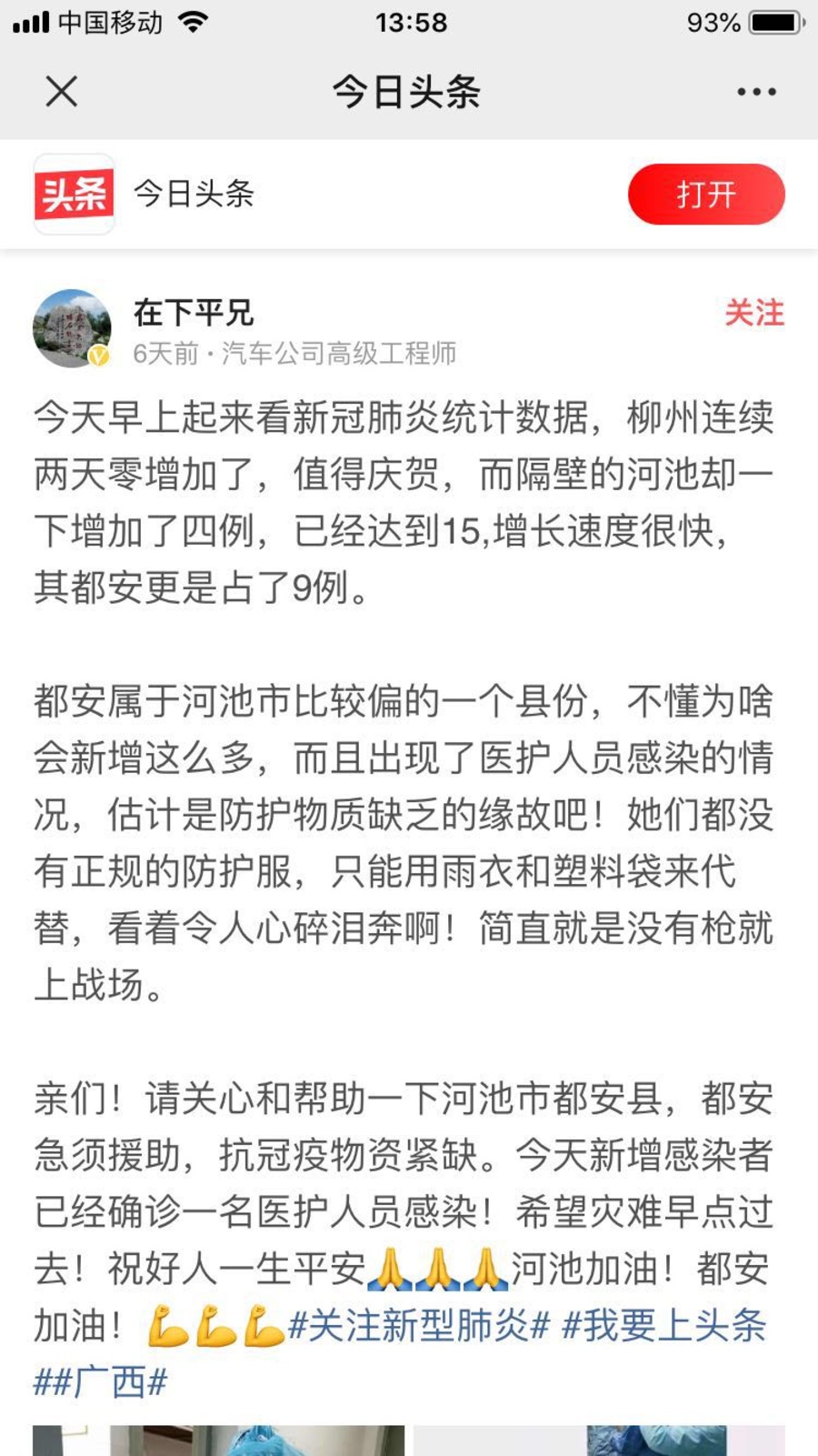 “亲们!请关心和帮助一下河池市都安县,都安急需援助,抗冠疫物资紧缺。”2月8日,上汽通用五菱汽车股份有限公司整车动力集成专家,教授级高工,九三柳州河西支社主委吕兆平在今日头条上发了一篇微头条,介绍广西都安县严峻的疫情防控形势:医生都没有正规的防护服,只能用雨衣和塑料袋来代替,看着令人心碎泪奔啊!简直就是没有枪就上战场……不到一天,阅读量就超过了50万,很多网友在文后留言问怎么捐赠,或者表示了对医务工作者的赞扬,并呼吁全国人民对都安县给予关注和支持。截至2月14日,该文章阅读量已达到59万,都安县的防控形势得到了广泛关注,面临的困难得到了帮助。