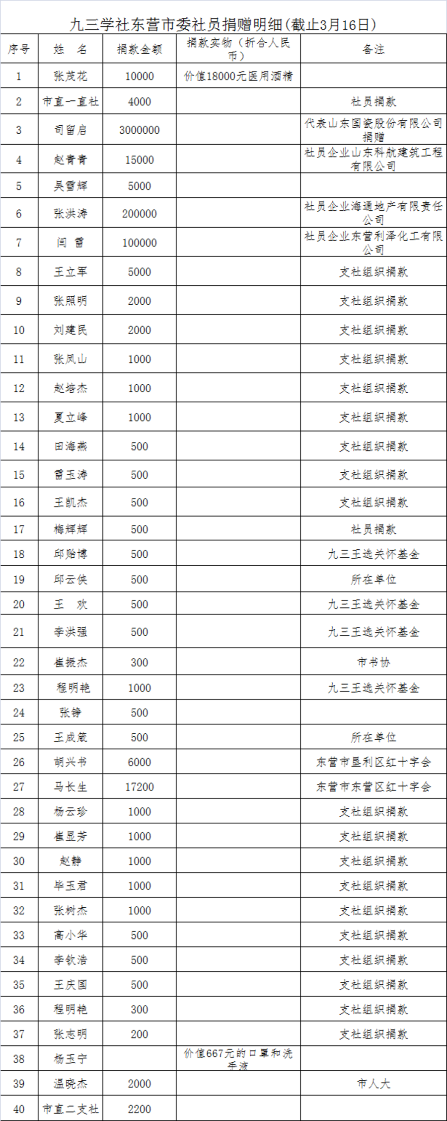 面对来势汹汹的新型冠状病毒感染的肺炎疫情,东营市九三学社社员伸出援手,献出爱心,以各种形式支持奋战在抗击疫情前线的广大医务工作者和坚守在防控一线的各行各业工作者,尽一己之力,献无限爱心。截止到3月16日,全市九三学社社员捐款捐物价值累计达3405367元。