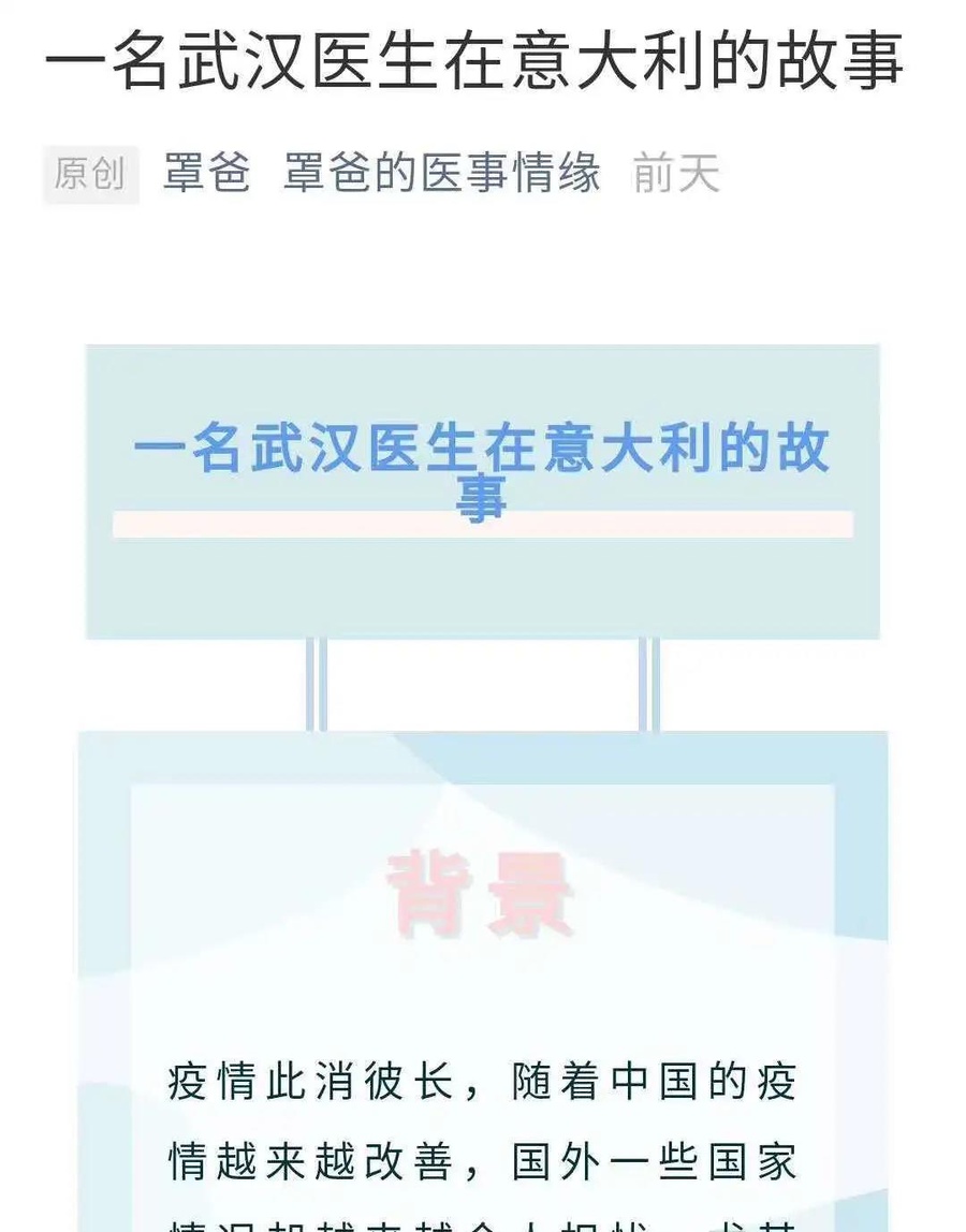 近日,他的微信公众号“罩爸的医事情缘”中一篇《一名武汉医生在意大利的故事》走红网络,中央电视台、广州日报、澎湃新闻、新浪网等争相报道和转载。