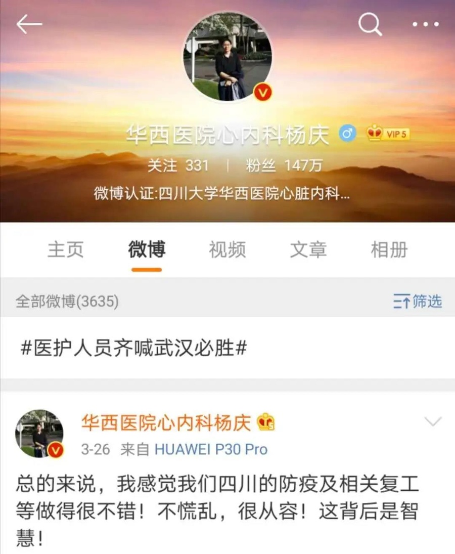他充分利用自己大V的身份通过今日头条、微博、“杨庆闲弹医迹江湖”公众号等媒体平台发布文章,讴歌医护人员不惧生死、挺身而出的奉献精神,科普疫情防控知识,帮助群众缓解紧张恐慌情绪。