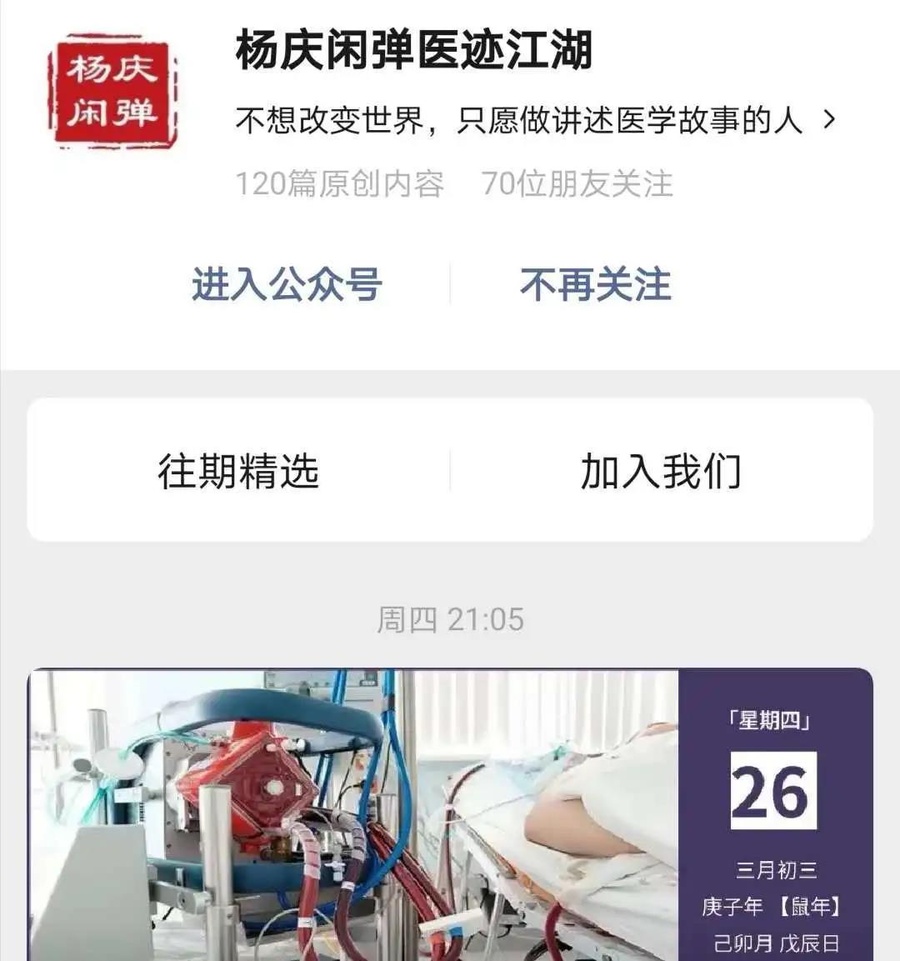 杨庆是个手术狂,因为过人的临床技术,在业内和患者中都享有盛誉,被称为华西射频消融术的第一把刀;作为自媒体人,杨庆的文章妙语连珠,闪烁着理性的光芒,他的粉丝满天下,被称为华西第一大V。