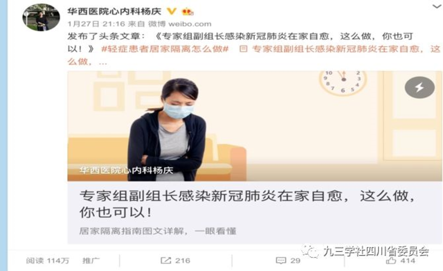 其中,《专家组副组长感染新冠肺炎在家自愈,这么做,你也可以!》在微博上获得114万阅读量;《武汉封城,白衣逆行》在微信公众号获得6.5万阅读量,微博获得10.6万阅读量;《除夕之夜,没有祥和,只有担心,拿什么帮你?我的武汉白衣战友》在微博上获得6.2万阅读量,微信公众号获得63.2万的阅读量。