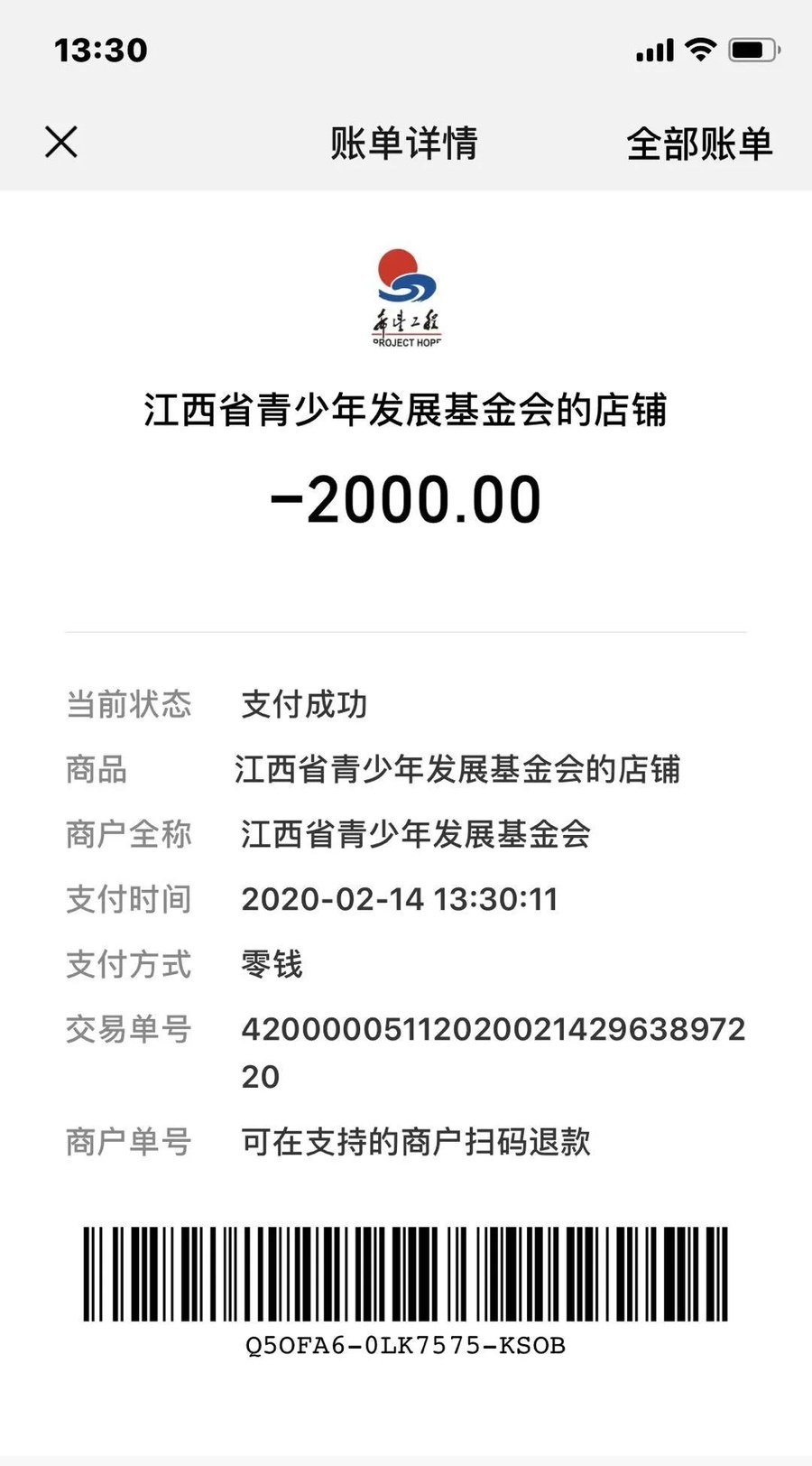 同时他还积极参与由江西省青年企业家协会与江西省青少年发展基金会、江西省青年联合会、江西省青创团工委联合组织的“抗击疫情,希望同行——江西希望工程特别行动”,个人捐款2000元,用于购买一线需求量大又极度紧缺的一次性口罩进行捐赠。他说:“我希望我们能用充满爱心的捐赠,成为守护人民健康生活的一线抗疫人员的坚强后盾”。