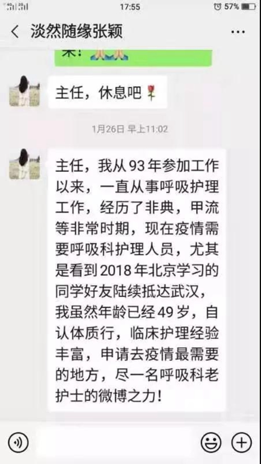 社员、滨州市人民医院呼吸内二科护士长张颖第一时间率先请战。作为护士长,她带领科室护理人员主动取消休假,投身紧张忙碌的工作。她报名时动情地写到:“我经历了非典、甲流等非常时期,现在疫情需要呼吸科护理人员,我自认身体不错,临床护理经验丰富,申请去疫情最需要的地方,尽一名呼吸科老护士的微薄之力!”