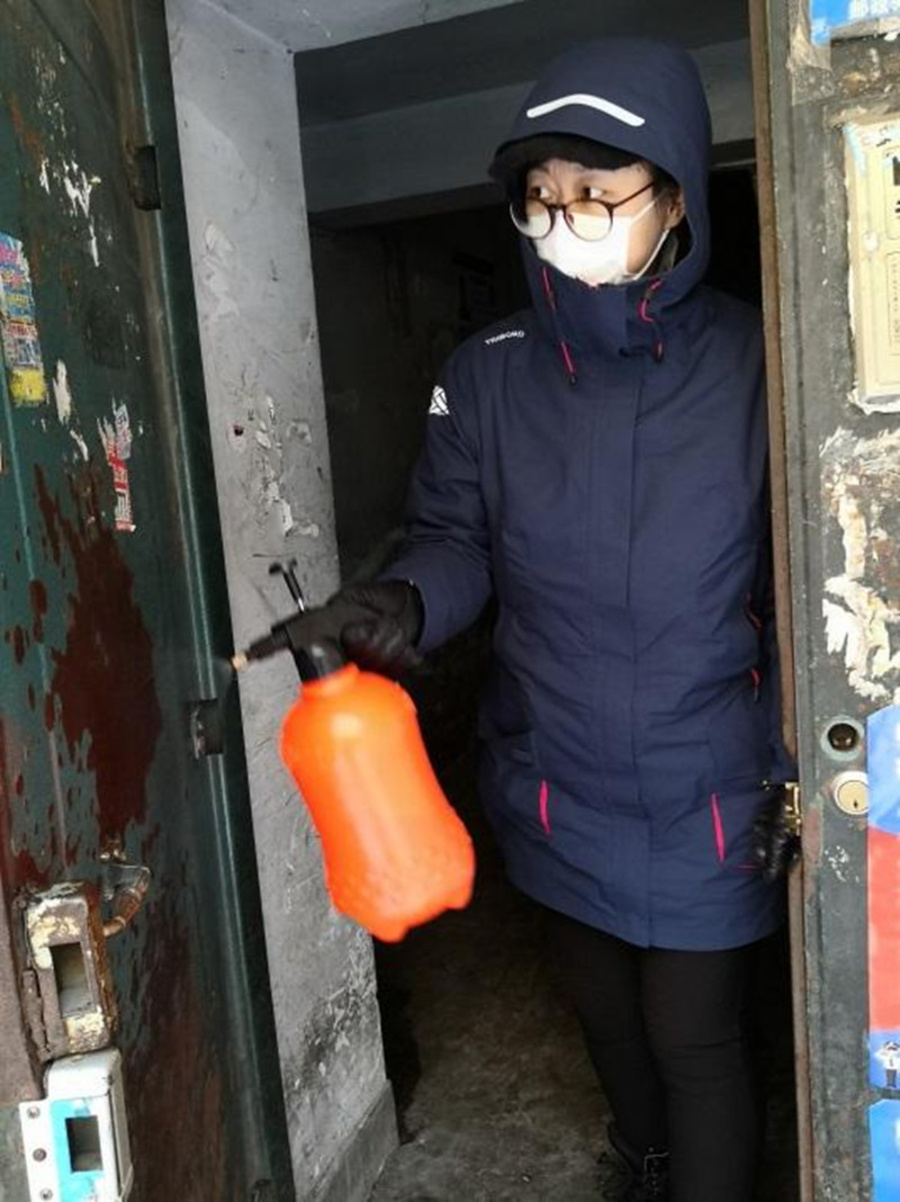 社区疫情防控“集结号”吹响后,王炜烨主动请缨,坚决要求参加一线防控队伍下到社区。六顺街道年代久、住户多,她来到社区的第一项任务就是对珠江路所辖的两个无物业小区进行楼道消毒,每天早、午、晚各消毒一次并做好记录。当她真正接手这份工作后才知道“一次”是什么概念,消杀前先做好个人防护,准备好稀释的84消毒液放在喷壶里,在卡点入口做好登记,进入小区,然后为两个小区和十几个六到七层不等的居民住宅楼消毒,从楼道扶手再到垃圾角全部消杀“一次”,几个小时下来棉袄都被汗水浸透了,楼道狭窄昏暗,每天都是在“坎坎坷坷”中完成任务。在消杀的同时,还要注意小区居民有什么需要,比如电闸不好用,楼道里有垃圾等等,这些情况都要及时反馈到社区,还要重点检查小区外地返回人员居家隔离时间。