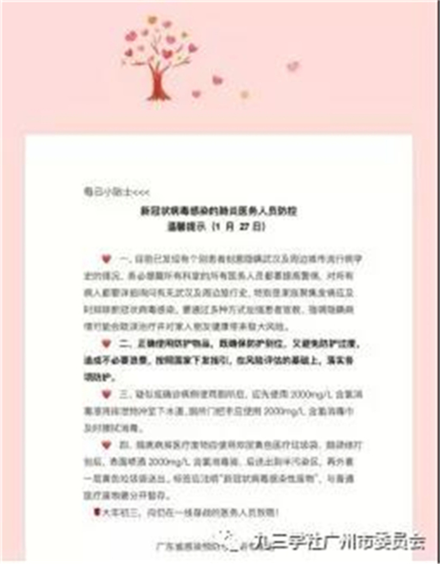 编者按:当前,新型冠状病毒感染的肺炎疫情严峻复杂。习近平总书记多次就疫情防控作出重要指示批示,强调生命重于泰山,疫情就是命令,防控就是责任。连日来,九三学社广州市各级组织和广大社员纷纷在各自的岗位上投入到抗击疫情的战斗中,用实际行动,为打赢疫情防控阻击战,奉献着智慧和力量。