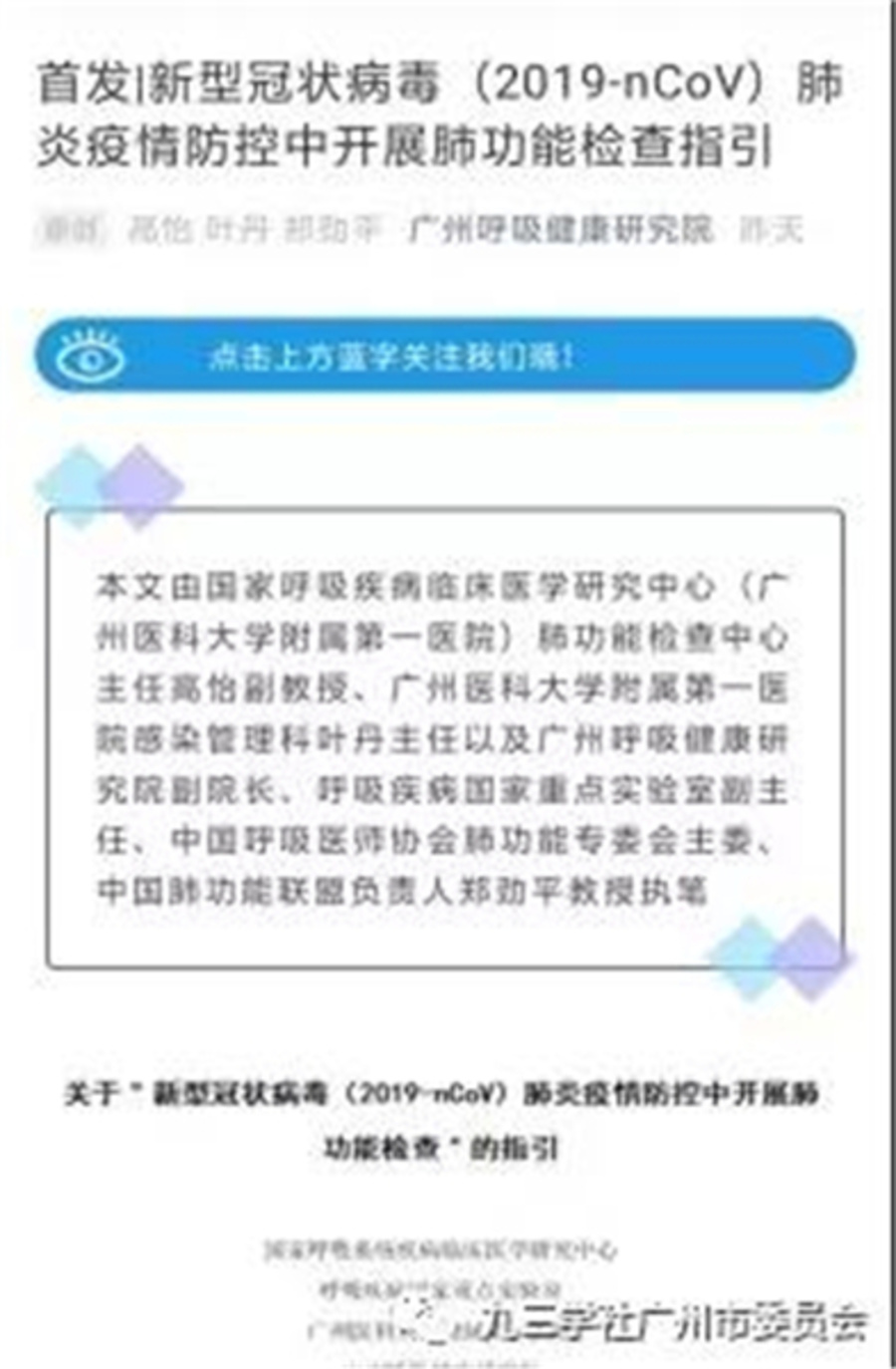 郑劲平等人执笔并首发关于“新型冠状病毒(2019-nCoV)肺炎疫情防控中开展肺功能检查”的操作指引