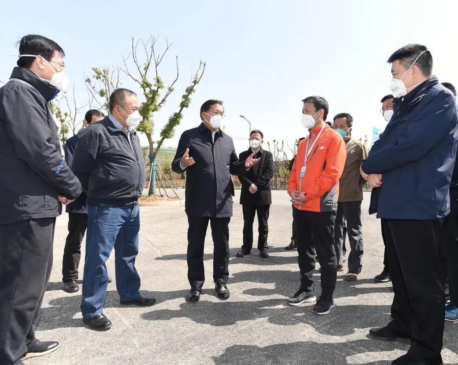 武汉雷神山医院,省委常委、市委书记王忠林带队一行看望慰问奋战一线的医务工作者及后勤保障人员,梁鸣(左一)在现场 (图片来源:长江日报微信公众号)